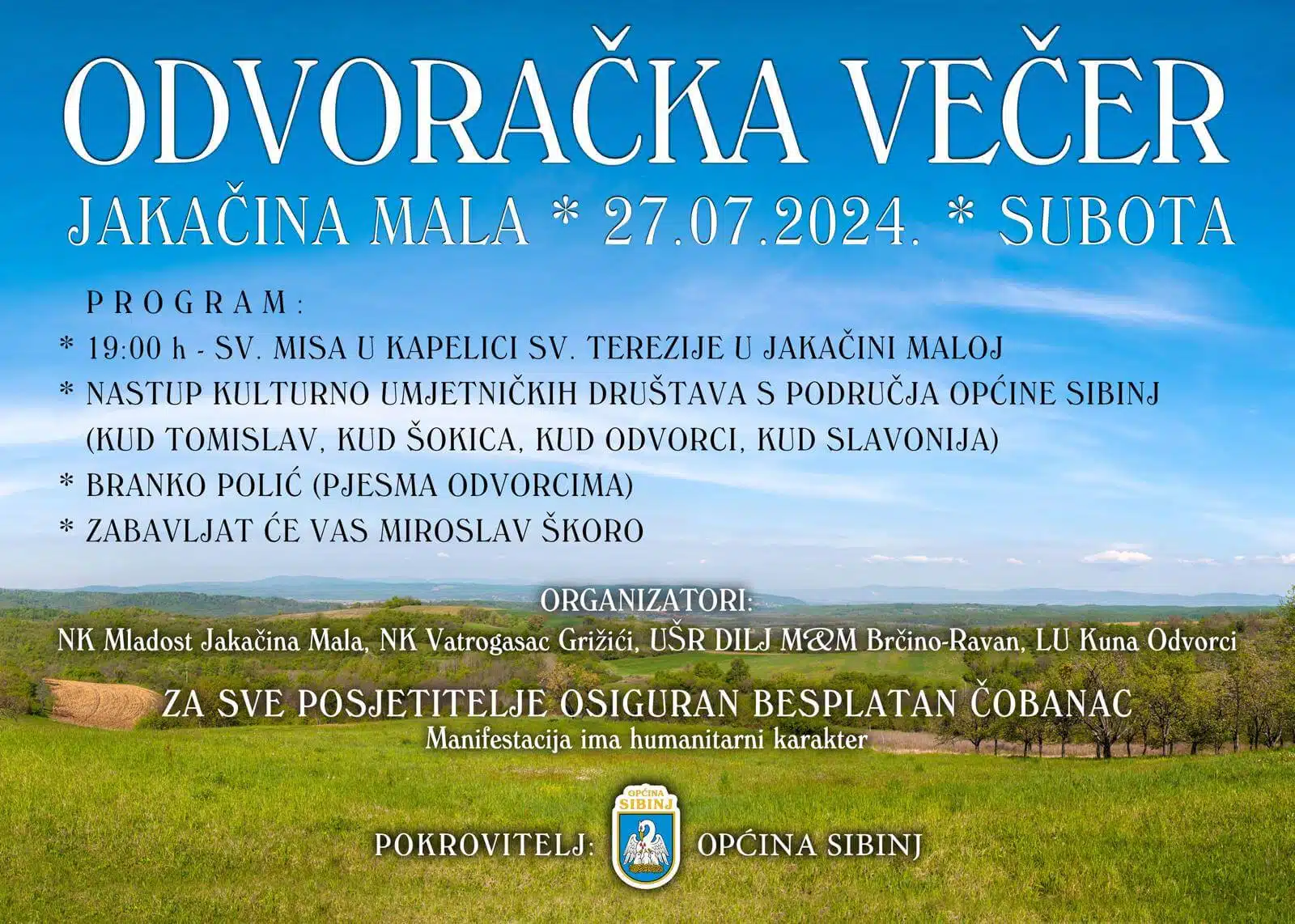 I ove godine, posljednja subota u srpnju rezervirana je za Odvoračku večer, centralnu zabavnu manifestaciju za Odvorčane i brojne posjetitelje s korijenima iz ovog kraja, kao i za sve one željne dobre zabave. Tako će Jakačina Mala 27. srpnja biti domaćin ove četvrte po redu manifestacije kojoj se mnogi mjesecima raduju.