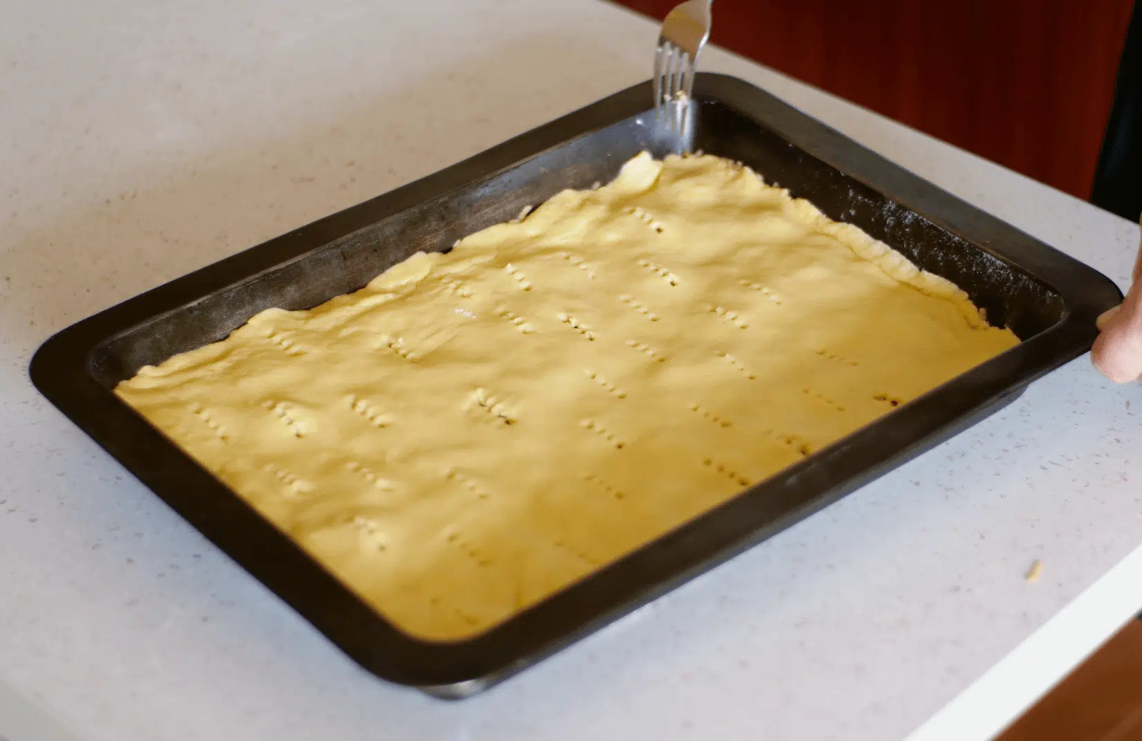 7. Drugi dio tijesta stavite preko jabuka i prije pečenja izbodite ga vilicom.